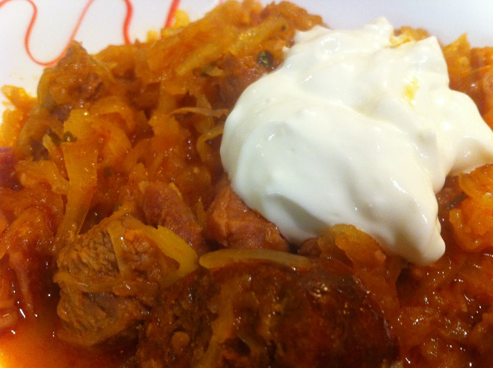 A pörköltöt félpuhára főzőm. Amíg ez rotyog, megmosom a káposztát (nem szükséges, ha nem túl savanyú) majd apróra vágom. Hozzáadom a húshoz, jól megkeverem és lefedve lassú tűzön puhára főzőm. Mivel volt még egy kis darab kolbászom illetve füstölt oldalasom, azt is hozzáadtam.