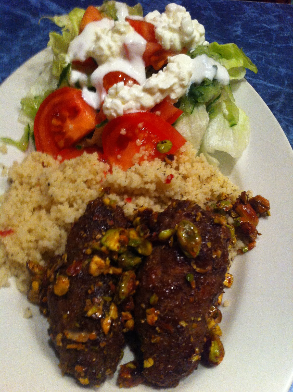 A végén a serpenyőt papírtörlővel töröljük ki, tegyük vissza a húst és adjuk hozzá a durvára tört pisztáciát és egy 1-2 ek mézet, majd az egészet pirítsuk együtt.