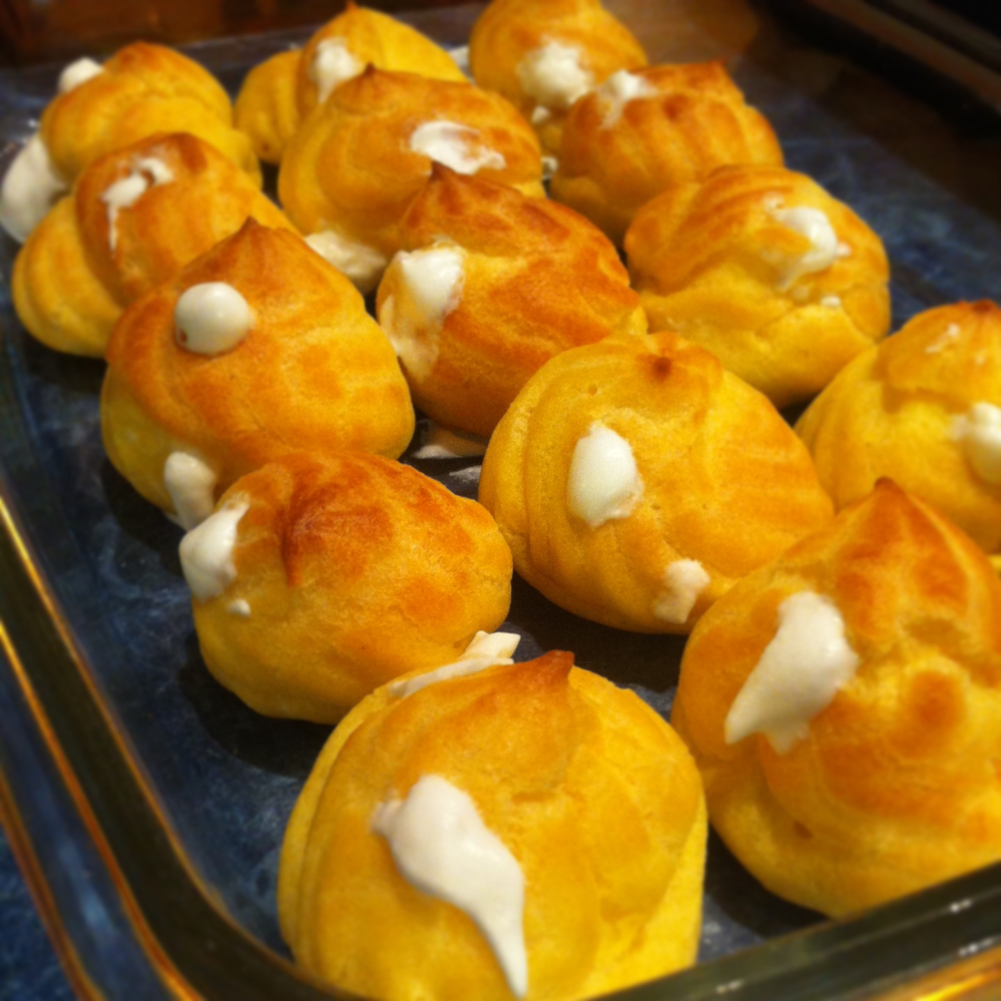 Forraljuk fel a vizet, majd tegyük hozzá a vajat és a sót, ezután szitáljuk bele a lisztet. Jól keverjük össze, vegyük le a tűzről és adjuk hozzá a tojásokat is. A masszát ezután tegyük nyomózsákba és egy kivajazott vagy sütőpapírral bevont tepsibe nyomjunk ki nagyjából 20 halmot. Süssük előmelegített sütőben, de ne sokáig. Nem kell megijedni, a halmok szépen megnőnek és üregesek lesznek. Ha kihűlt ollóval fúrjunk lyukat beléjük.