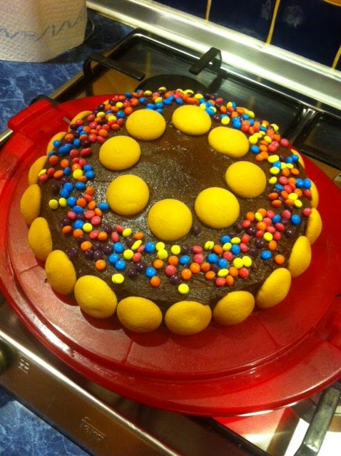 A díszítésben nem vagyok jó. Így piskóta tallérokkal raktam körbe illetve színes csokidarabokkal szórtam meg a közepét. A gyertyák a belső talléros kör közepébe kerültek…elvileg.