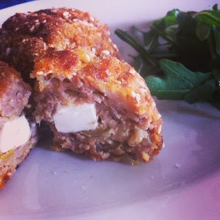 Hozzávalók: 50 dkg darált hús, 1 db tojás, 1 kis fej vöröshagyma, 2 gerezd fokhagyma, 1,5 tejben áztatott zsemle, só, bors, zsemlemorzsa, feta sajt, zöld olíva bogyó