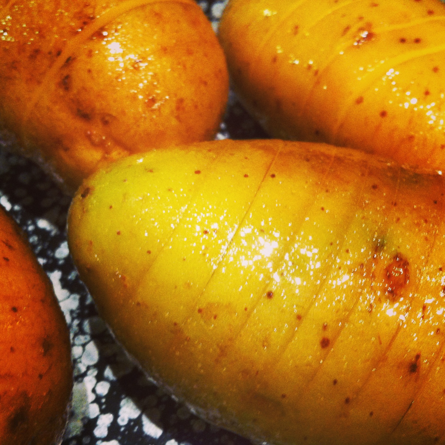 A burgonyákat jól megmossuk majd legyezőszerűen bevagdossuk. Kevés olajat és sót összekeverünk és ezzel bekenjük a burgonyákat (bevágásokat is). Ezzel mehet is a sütőbe.