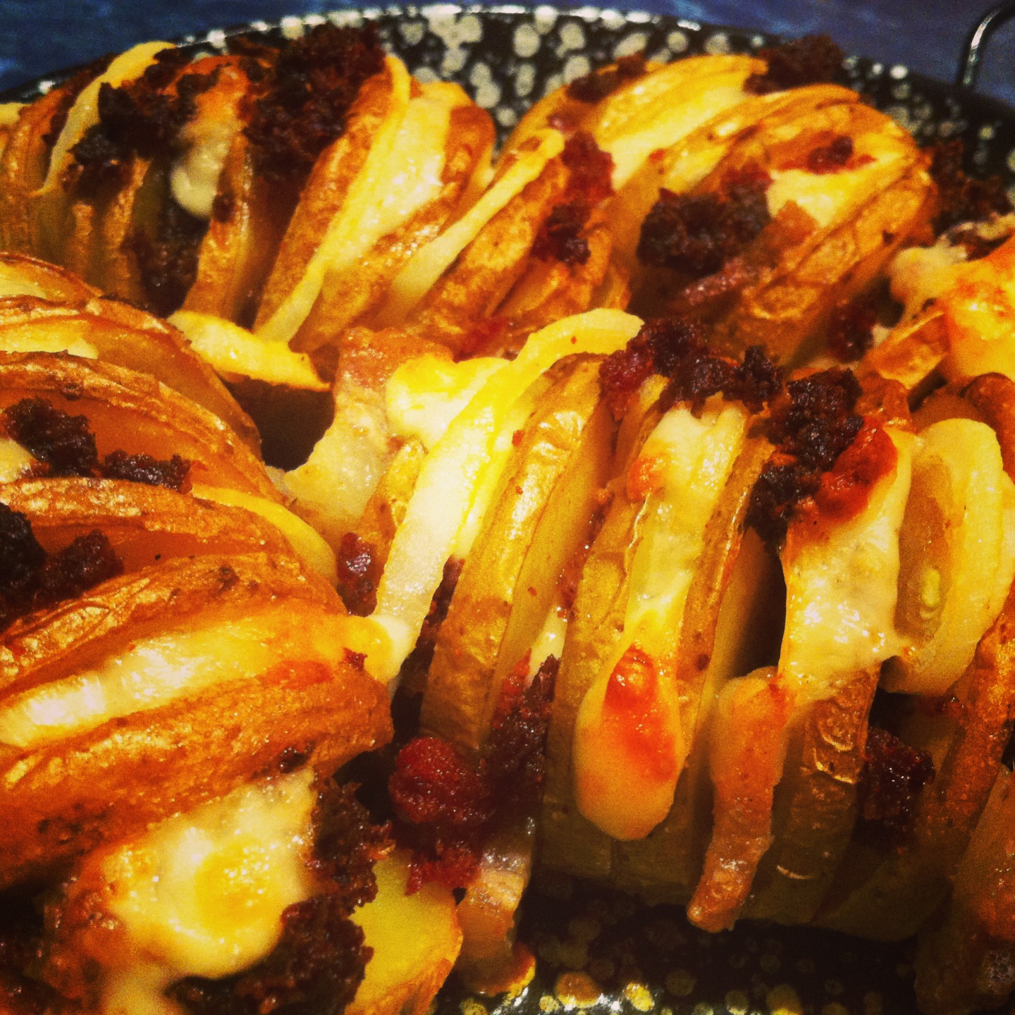 A burgonyákat jól megmossuk majd legyezőszerűen bevagdossuk. Kevés olajat és sót összekeverünk és ezzel bekenjük a burgonyákat (bevágásokat is). Ezzel mehet is a sütőbe.