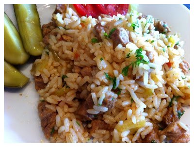 Kevés zsiradékon (én mangalica zsírt használtam) megfonnyasztjuk a hagymát. Ezután mehet bele a hús is, amit fehéredésig pirítunk. Megszórom paprikával, sóval és borssal és saját levében 20 percig főzöm. Ezután adom hozzá a paradicsomot és paprikát, amivel újabb 25 percig párolom. Amíg fő, a rizst kevés zsiradékon kissé megpirítom majd hozzáadom a húshoz. Ráöntöm a 500 ml forró levet és egyszer felforralom. Ezután teszem át egy tepsibe vagy jénaiba az egészet és előmelegített sütőben 200 fokon nagyjából 20 percig (sütöm). 10 perc után egyszer átkeverem az egészet. A végén megszórom petrezselyemmel. Uborkával tálalom.