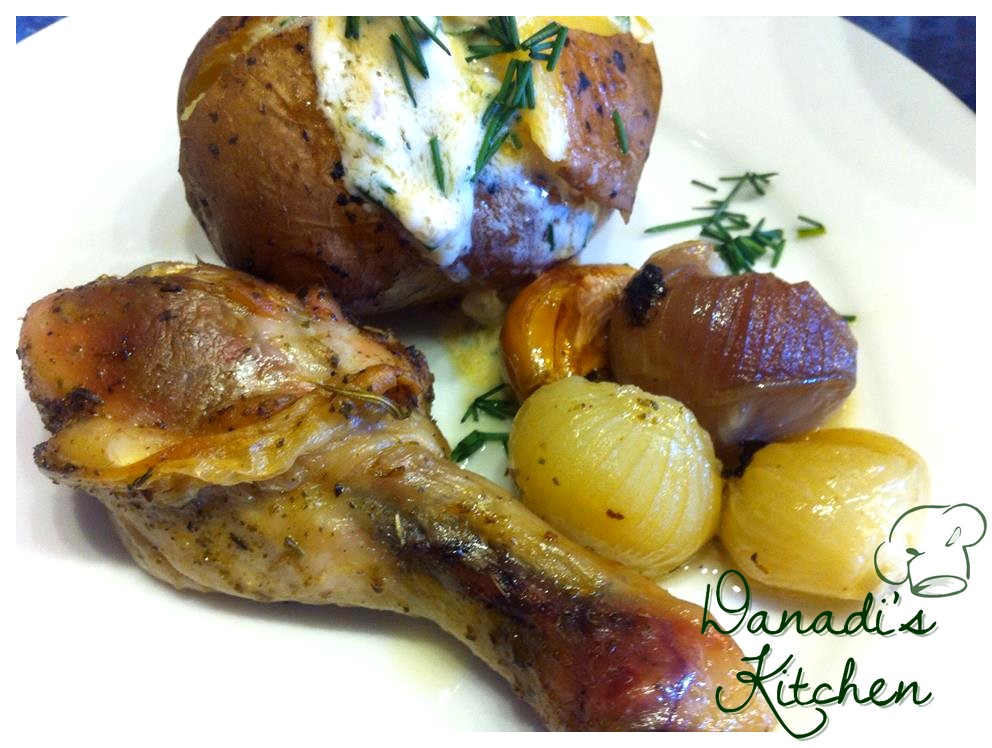 A csirkecombokat jól megmosom, megszárítom. Ezután bedörzsölöm a fűszerekkel. Mehet is egy tepsibe. A hagymákat megtisztítom és így egészben teszem a húsok mellé. Tetejét meglocsolom olíva olajjal, kevés vizet teszek alá majd néhány szál rozmaring ágat is mellérakok. Előmelegített sütőben sütöm nagyjából 45 percen keresztül, ezután szedem le róla a fedőt és egy kicsit meg is pirítom.